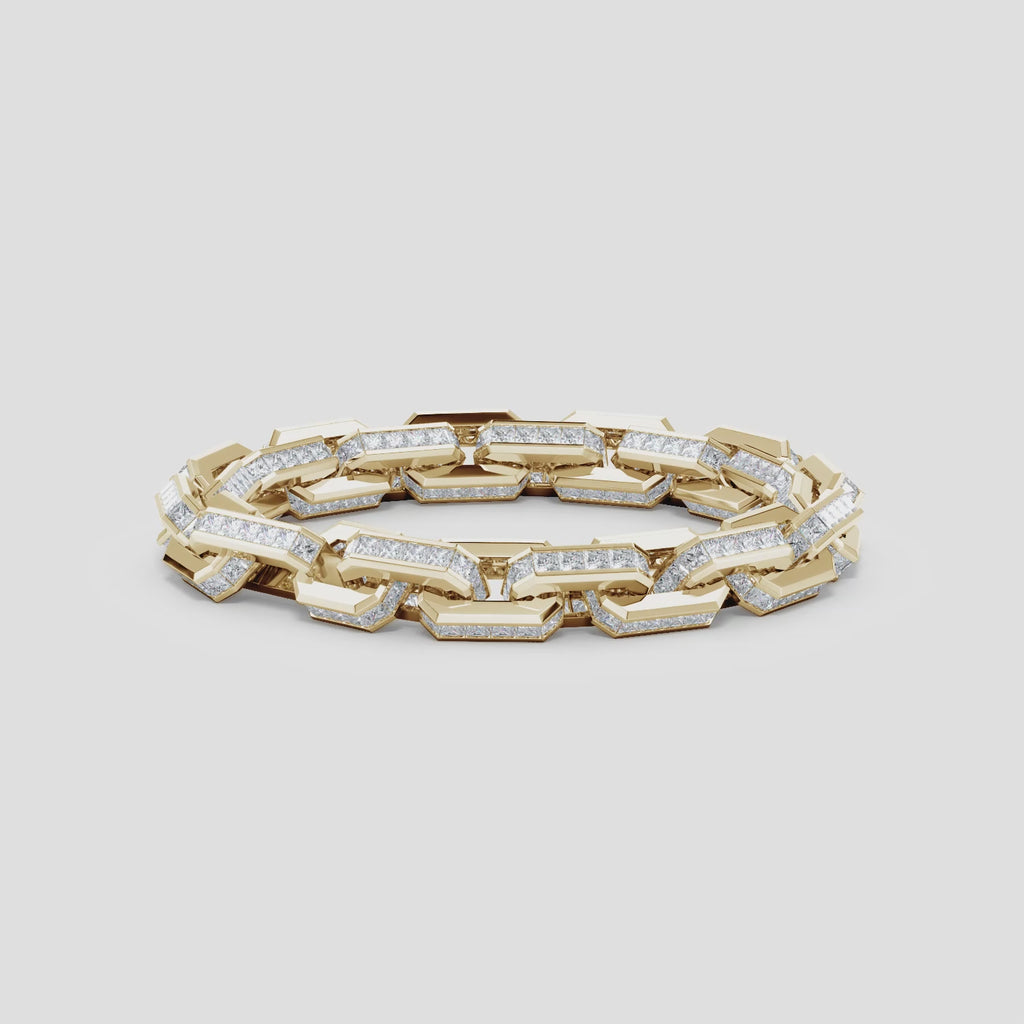 Crafted by Diwera Jewels, this commanding men’s bracelet features elongated octagonal links paired with the sharp brilliance of princess-cut diamonds. The geometric design creates a bold, architectural look, while each diamond is meticulously set to enhance its clean lines and radiant sparkle. Modern, sophisticated, and powerfully stylish, this bracelet makes a distinct statement of refined luxury for the contemporary gentleman.