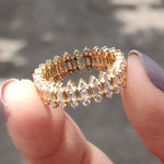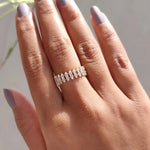 The baguette and round wedding band is a stunning representation of modern design. Therefore, featuring both baguette cut moissanite and round cut moissanite, this band offers exceptional brilliance. Crafted from yellow gold wedding band material, the piece exudes warmth and sophistication. The three row pave band ensures an extra layer of sparkle, making it a unique wedding band you’ll cherish forever.