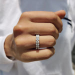 The oval Moissanite wedding band brings a clean, bold look with its long stone shapes and full-circle shine. Each oval cut Moissanite band is set in a strong shared prong wedding band.